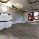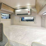 ▲常設ダブルベッドの下は3方向に扉が備わり、荷物を出し入れできるラゲッジスペース。長尺物も楽に収納できる