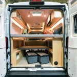 ▲常設リヤベッド下の収納スペース。ベッドマットを跳ね上げれば自転車や大型のキャンプギアも余裕で積み込める広さだ