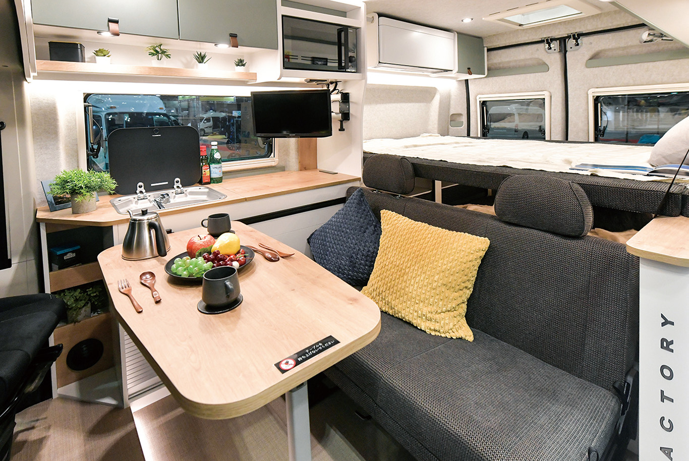 ▲日本仕様のバンコンによく見られる「奥家具」といわれる、シートの奥にキッチン家具を配したレイアウトを採用