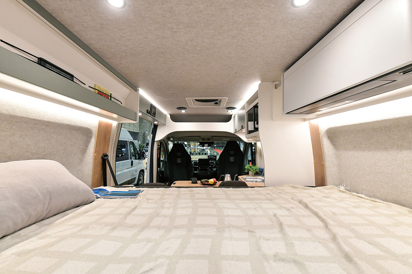 ▲ベッド下が大容量の収納スペースになっている、ハイマウント形式のリヤ常設ベッド。サイズは1910×1200㎜で大人3人がゆったり寝られる