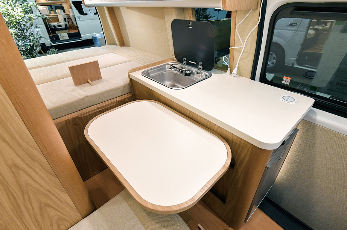 ▲スライドドアのすぐ横に備わるキッチン家具。冷蔵庫がスライドドア側にあり、車外から中身を取り出しやすい