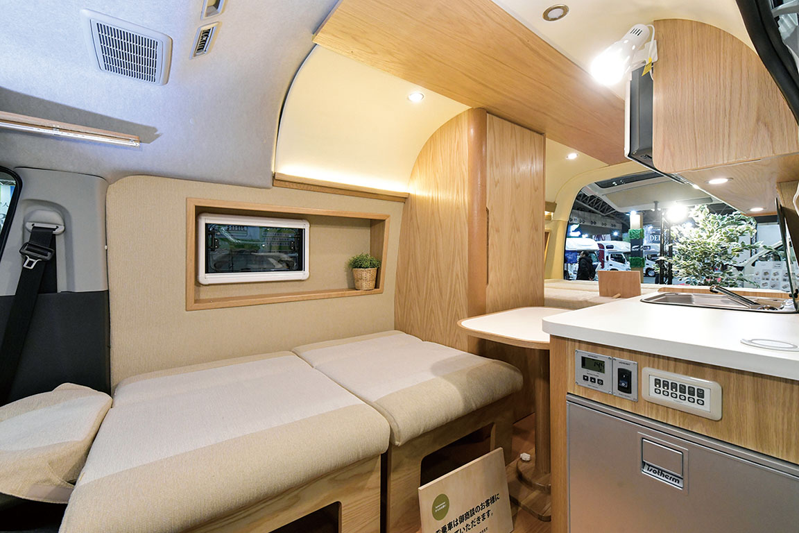▲エンジンが前席下にあるキャブオーバー車の特徴を生かした、前席の背もたれを利用するオリジナルのダイネット