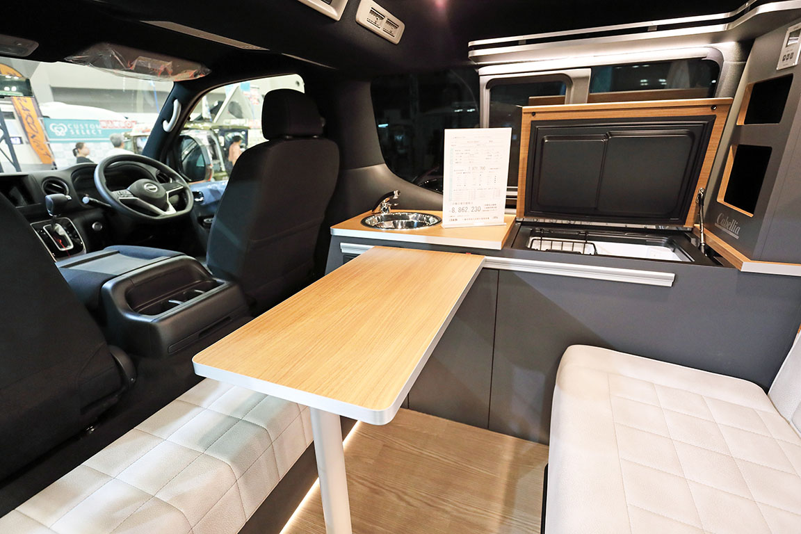 ▲セカンドシートはFASP506ベースのアルフレックスオリジナル仕様。1000㎜幅の2人掛けで3点式シートベルトを装備。前席下にエンジンがあるキャブオーバー車特有の、エンジンフードの盛り上がりを利用したフロントチェストが簡易的なベンチになり、セカンドシートとフォールディングテーブルを囲むリビングダイネットを形成