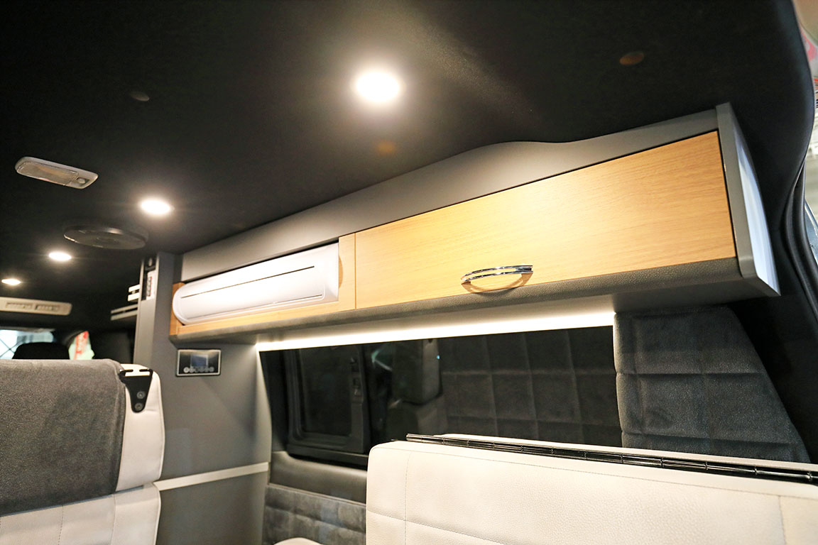 ▲DC12Vの自動車用ルームエアコンの室内機をオーバーヘッドキャビネットと並列でビルドイン。レノジーの300Aのリン酸鉄リチウムサブバッテリーまたは外部AC電源につないで稼働する
