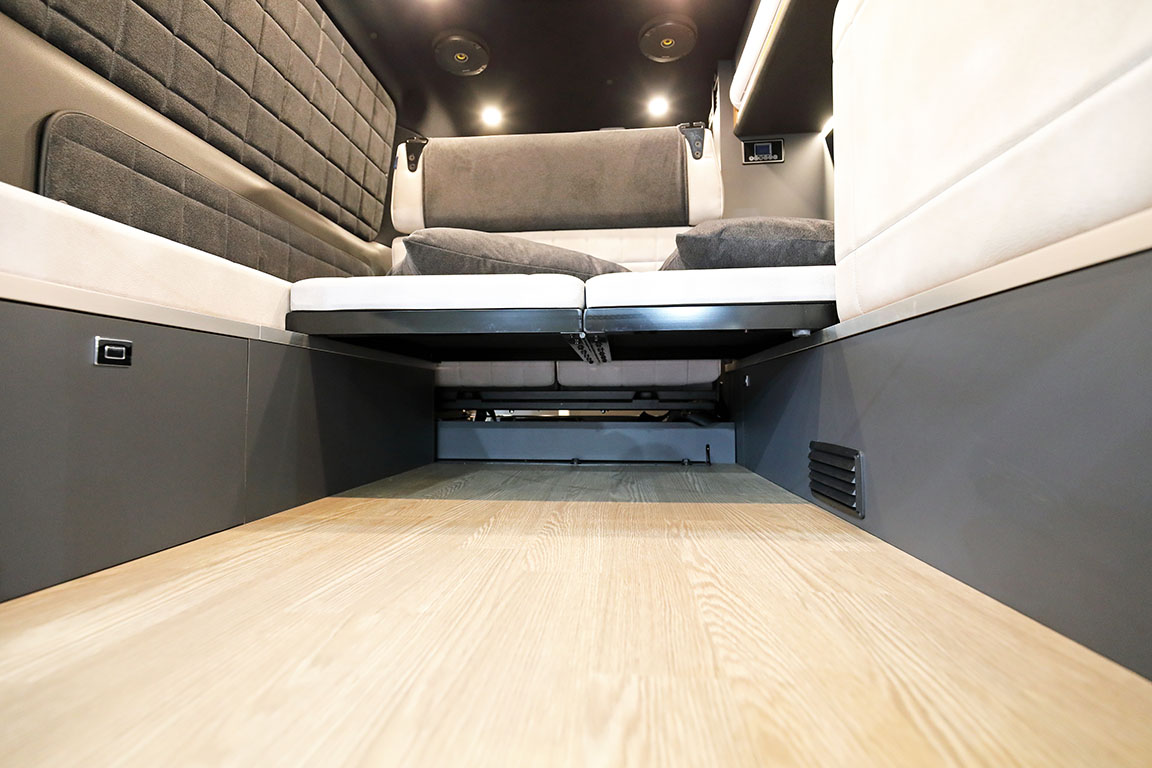▲独自開発のパンタフレームと一体になったマットレスを折り畳むと、ラゲッジスペースを最大限に確保できる