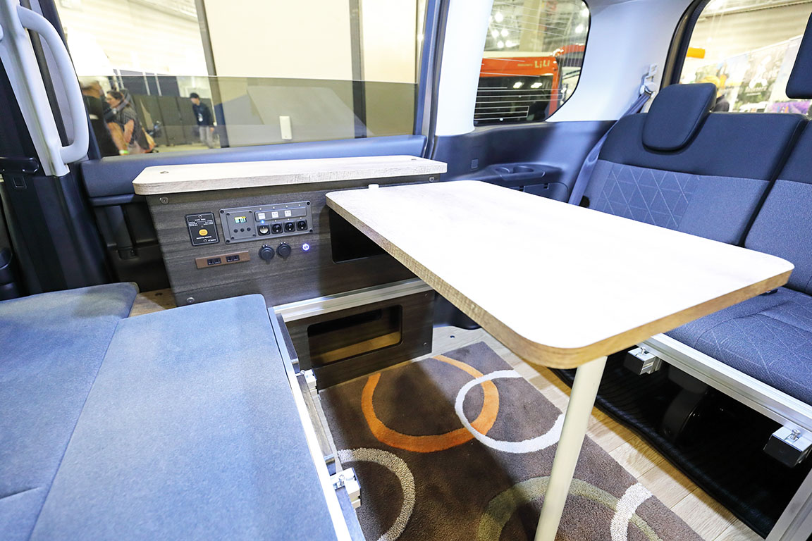 ▲3列シート・8人乗りから2列目シートを取り払い、2列シート・5人乗りに構造変更。2列目シートの部分にベンチ兼収納ボックスを設け、3列目シートとダイネットを形成する
