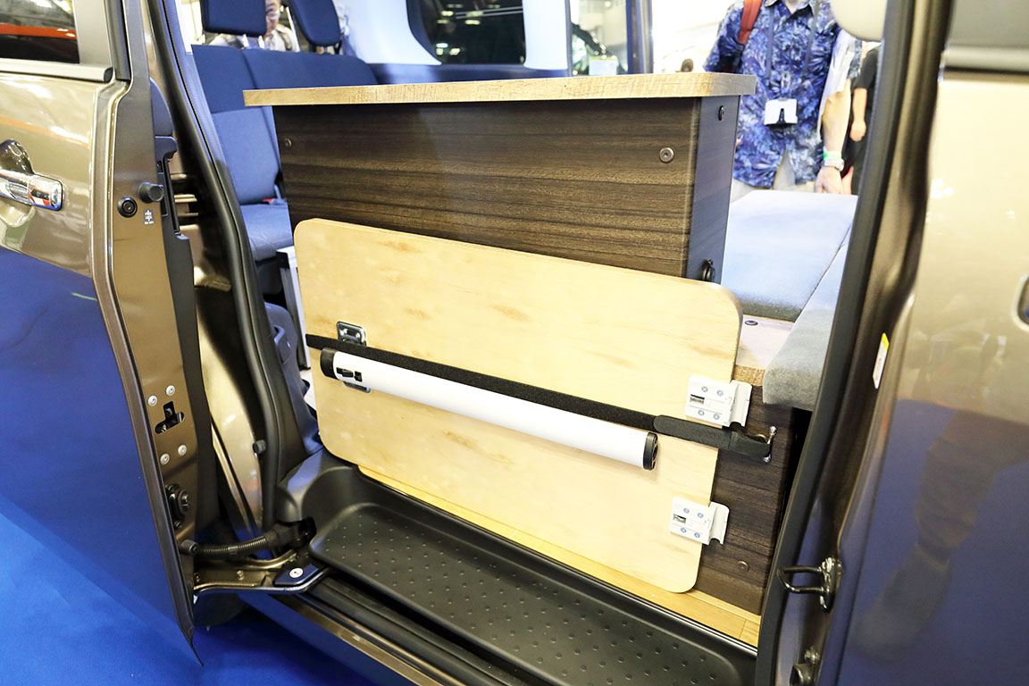 ▲取り外したテーブルは運転席側のスライドドアを開けると現れる、カウンター付きキャビネット裏側に収納できる
