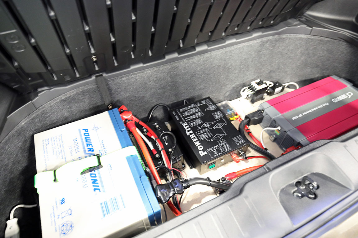 ▲充電効率に優れるCTEK走行充電システム、1500Wインバーター、100Aサブバッテリーなどの電装系はラゲッジアンダーボックスに収まる
