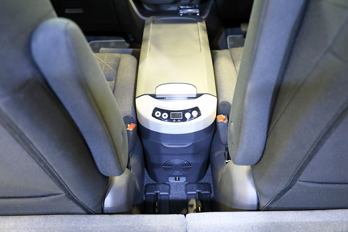 ▲運転席と助手席の間にピッタリ収まる18L冷凍冷蔵庫はオプション