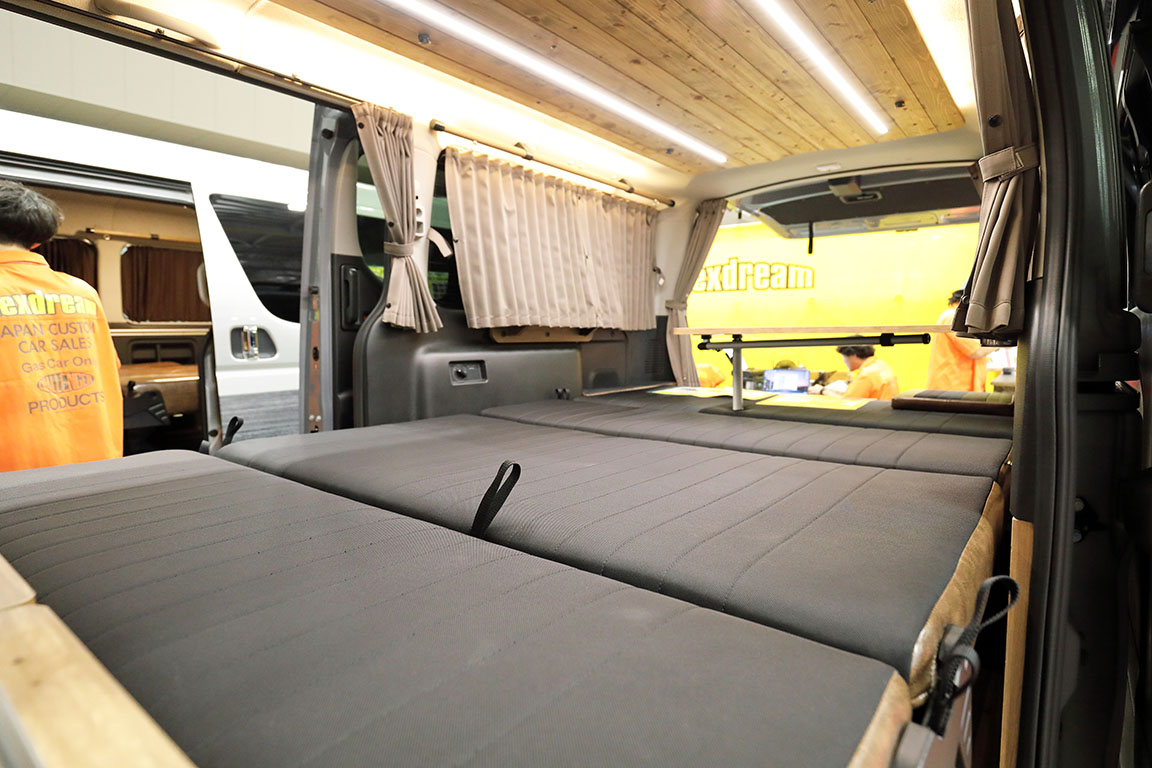 ▲2/3列目シートをフラットにするとフロア全面がベッドに。内装トリムとシートの隙間に物が落下しないように最小限に詰めている