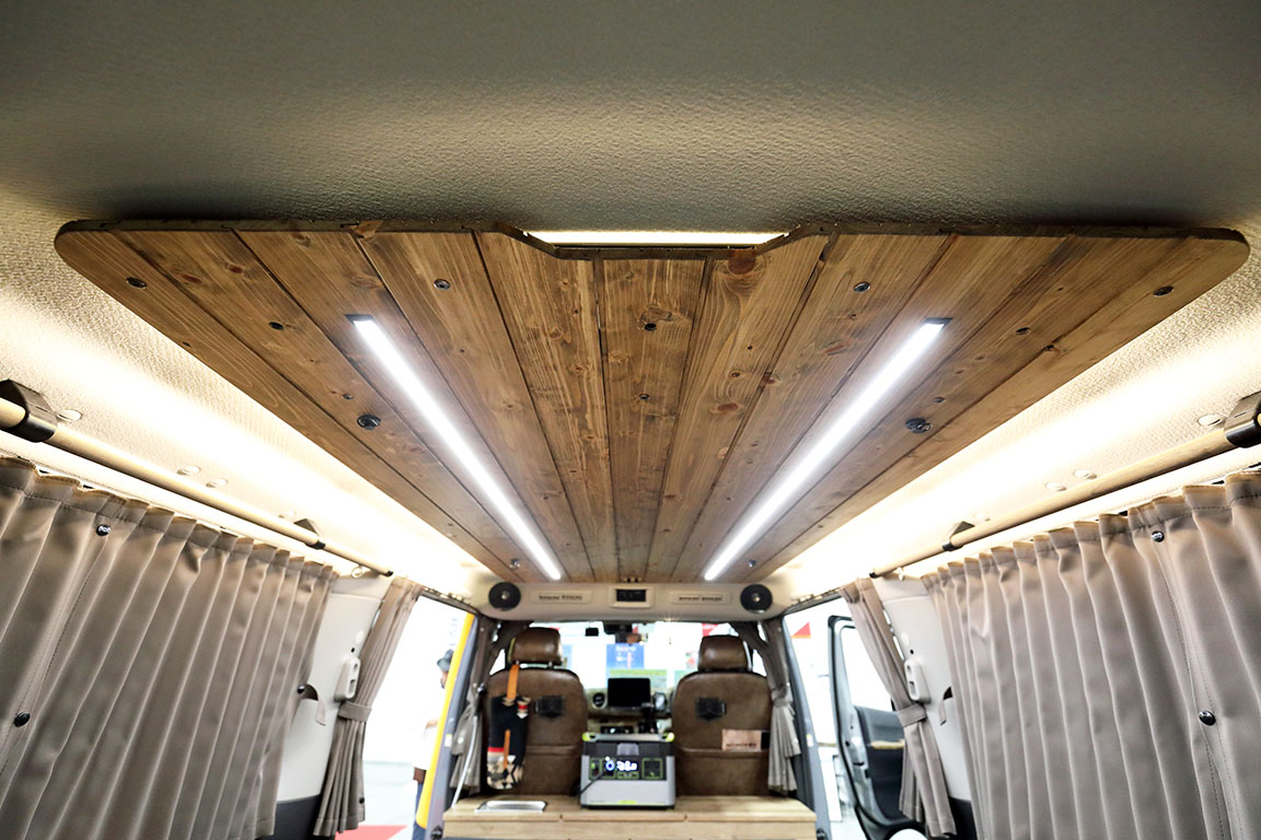 ▲LEDダウンライトと間接照明が埋め込まれた天井ウッドパネル。ビンテージ調のシート表皮と調和して温かみのある空間を演出