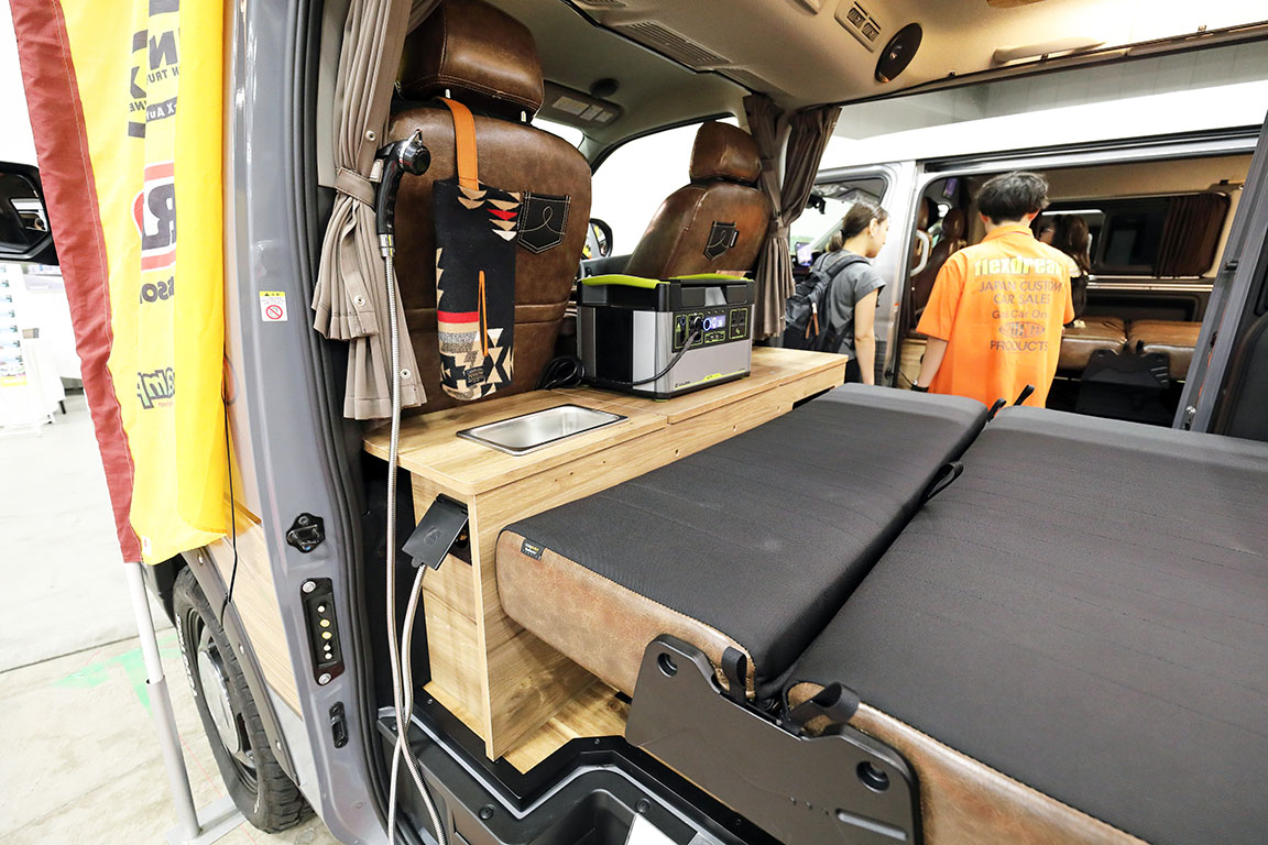 ▲フロントキャビネットにコンパクトなシンクとコンロを収めて8ナンバーの構造要件をクリア。シャワーは助手席側スライドドアから車外に引き出して使える