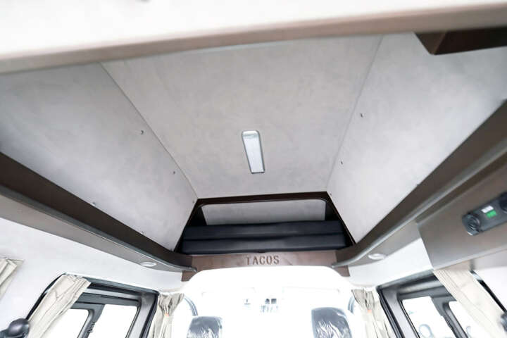 ▲ハイルーフ部に展開するベッドは長さ2100×幅1100×高さ440㎜。後部に採光&換気用のアクリル窓が備わる