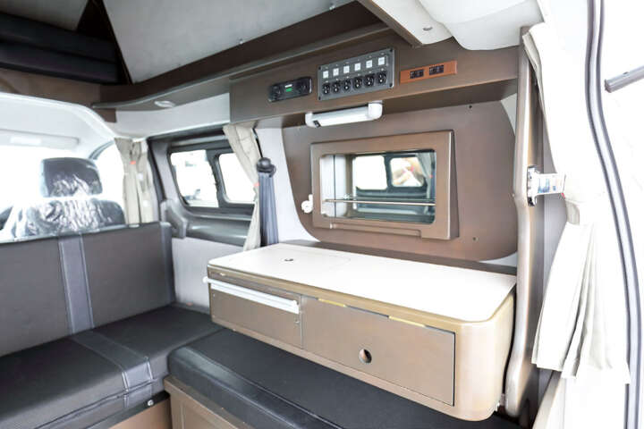 ▲運転席側のリヤクォーターウインドウはFRPボックスで拡張。この部分に跳ね上げ格納式のシンクが備わり、格納時の車内への張り出しを抑える