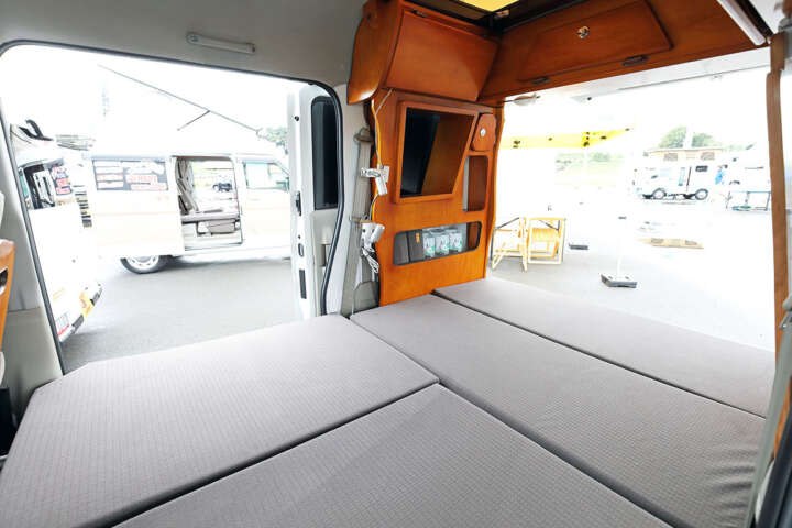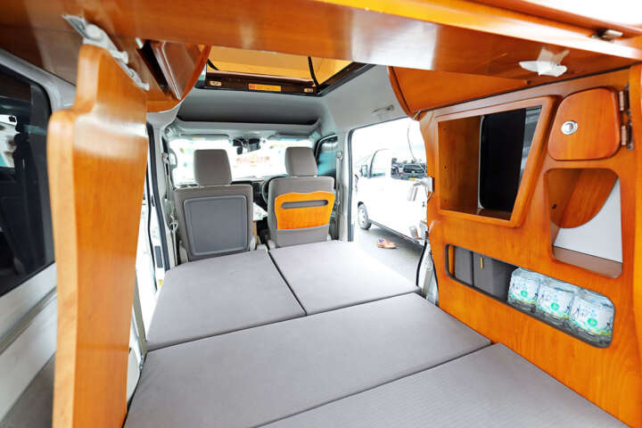 ベース車はスズキ・エブリイバン。普段使いと車中泊を両立できる程良いサイズ感で、ポップアップルーフを閉じると全高2m以下に収まるので機械式立体駐車場にも乗り入れ可能。高級感のあるキャビネットは収納力と使い勝手のよさを兼ね備え、自由気ままなひとり旅や趣味の相棒に最適だ。