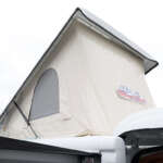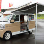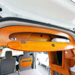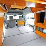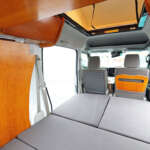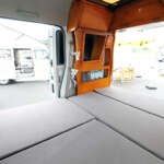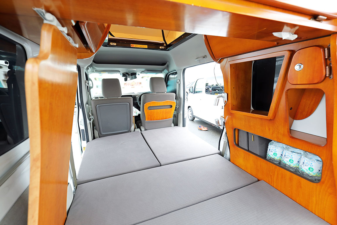 ▲純正2列目シートを格納した状態でフルフラットになるように、荷室空間をかさ上げして段差を解消。床下部分を収納に利用している。フロアベッドのサイズは長さ1980×幅1260㎜