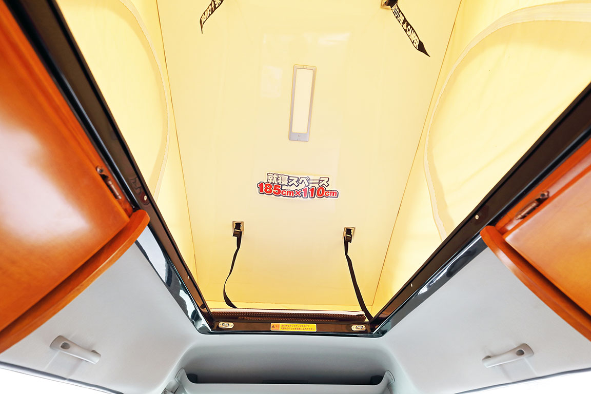 ▲テント内のロフトベッドは長さ1850×幅1100㎜。大人2人がゆったり寝られる。1人旅ならフロアベッドで就寝する際の荷物置き場として使える