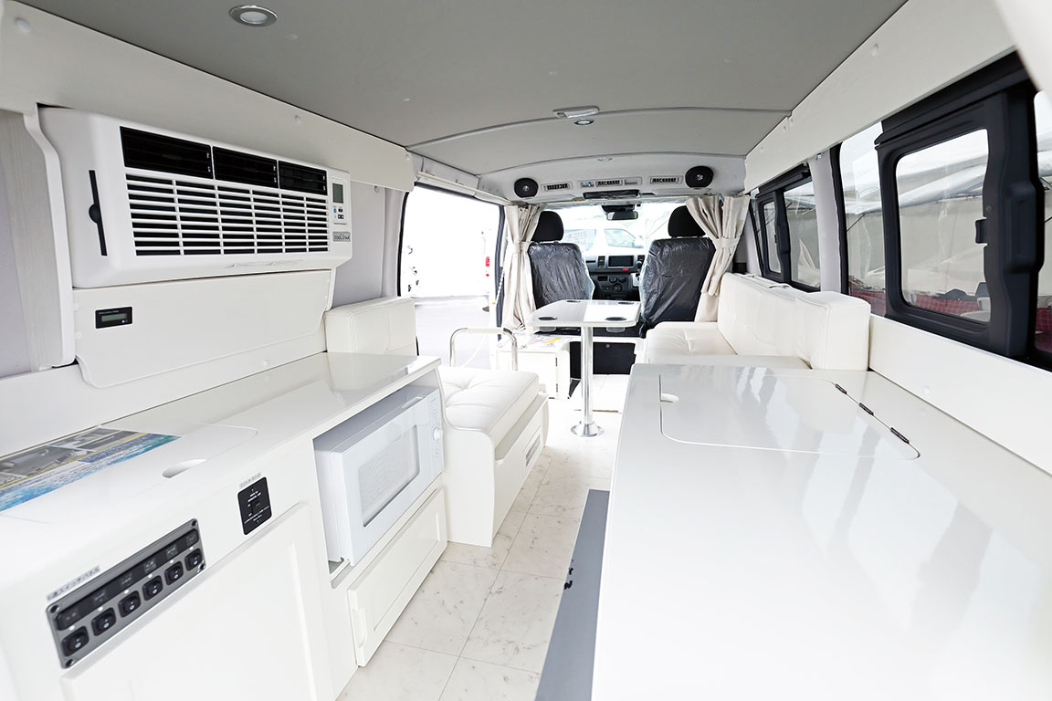 ▲給排水タンクを取り出しやすいように、バックドア側にステンレスシンクと6連スイッチパネル、標準装備の電子レンジをビルトイン
