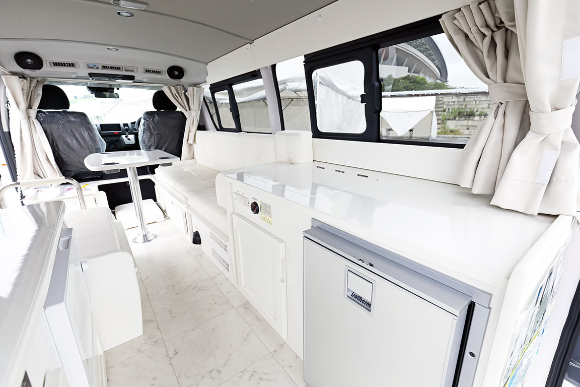 ▲シンクの対面にはフリーザー付き49L冷蔵庫が備わる。全面ベッドにした状態でも扉を開け閉めでき、電子レンジやシンクも使用できる