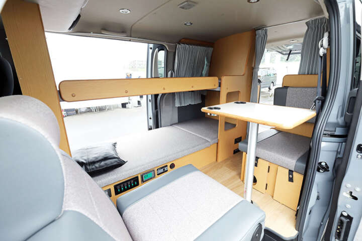 取り回しのいいバン上級グレードのプレミアムGX(ロングボディ/標準幅/標準ルーフ)を使い、フロントの居住・就寝スペースとリヤのキッチンスペースを隔てた2ルームレイアウトのキャンピング架装を施している。