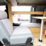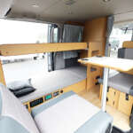 リヤスペースにはアルミ加工が施され、濡れ物を入れられる排水栓付きの床下収納が備わる。助手席側キャビネットにフタ付きシンクと各13Lの給排水タンクが収まる。シンク上のDC12V車載クーラーはオプション(115万5000円)。