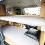 ▲2段ベッドのサイズは下段が長さ1850×幅700㎜、上段が長さ1850×幅650㎜。対面のダイネットも長さ1850×幅500㎜のシングルベッドになる