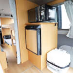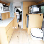 ▲就寝&居住スペースとは壁とカーテンで仕切られたリヤキッチンスペース。運転席側に標準装備の横開き冷蔵庫と電子レンジを収めたタワーキャビネット、ポータブルトイレを設置。トイレはオプションで密封式のラップポンにアップグレードできる
