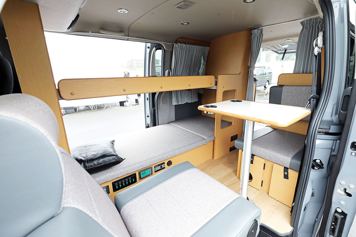 ▲運転席側に2人掛け横座りソファを兼ねた2段ベッド、助手席側に1人掛けFASPセカンドシートと固定のサードシートを配置
