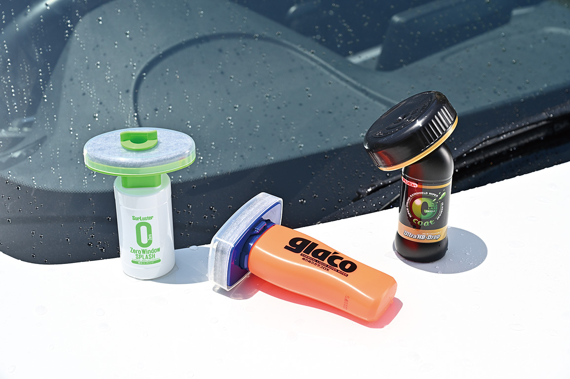 雨量が多くなる季節は安全に運転できる視界の確保が重要。雨をビンビンに弾いて走行風で吹き飛ばし、クリアな視界をキープするガラス撥水コーティング剤は雨天ドライブのマストアイテムだ。