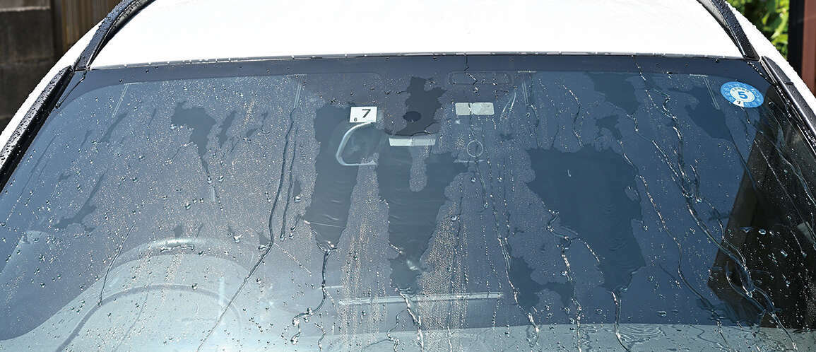▲以前施工した撥水被膜が部分的に残り、ルーフに塗布したワックスも付着してギラついた油膜になっている