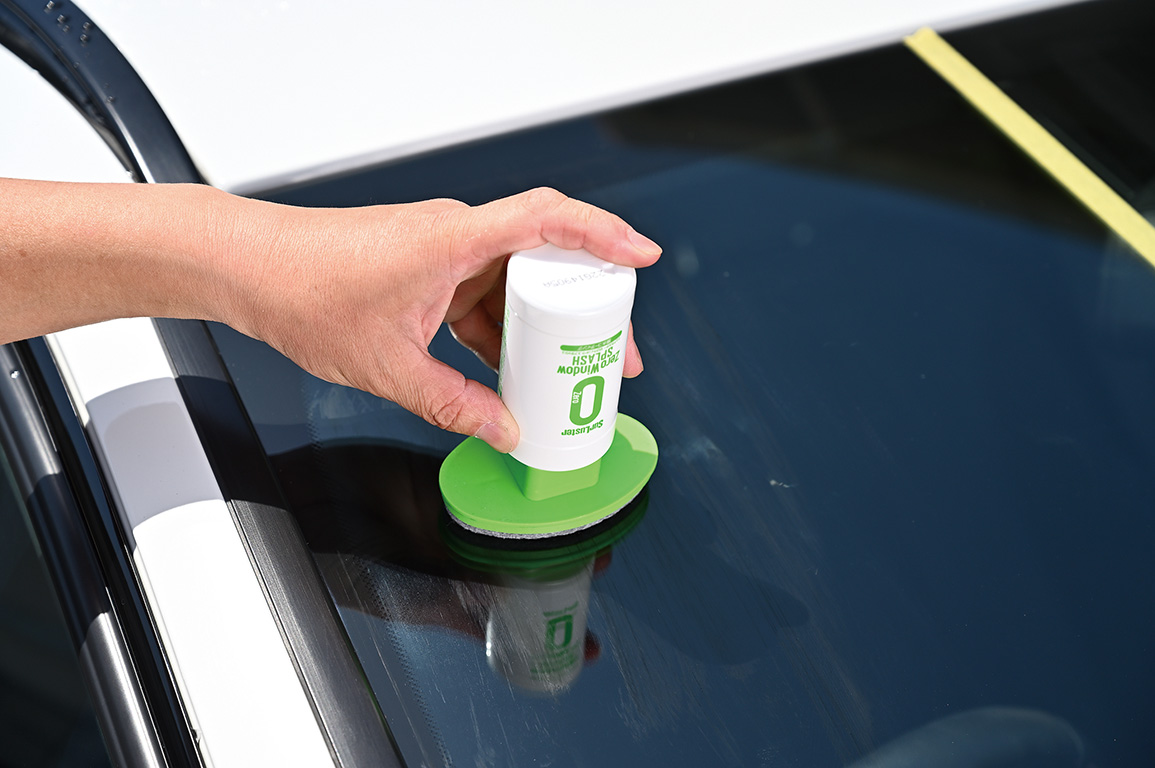 ▲幅8㎝の楕円形ヘッドを採用。角が丸くガラスの端まで塗り込める。1本でフロントガラス約15枚分を施工できる