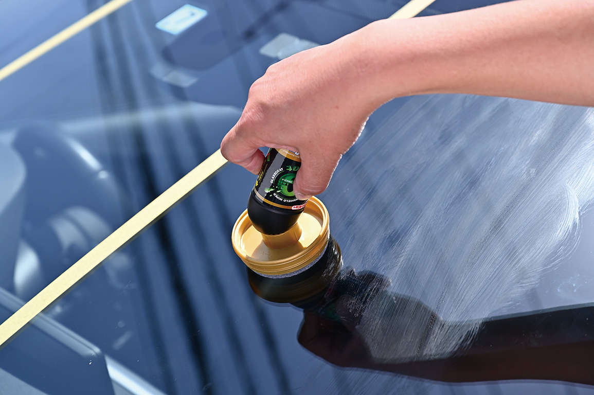 ▲握りやすい細身のボトルに斜めにセットされた丸型のヘッド。直径6.5㎝のビッグサイズで、スムーズに塗り込める