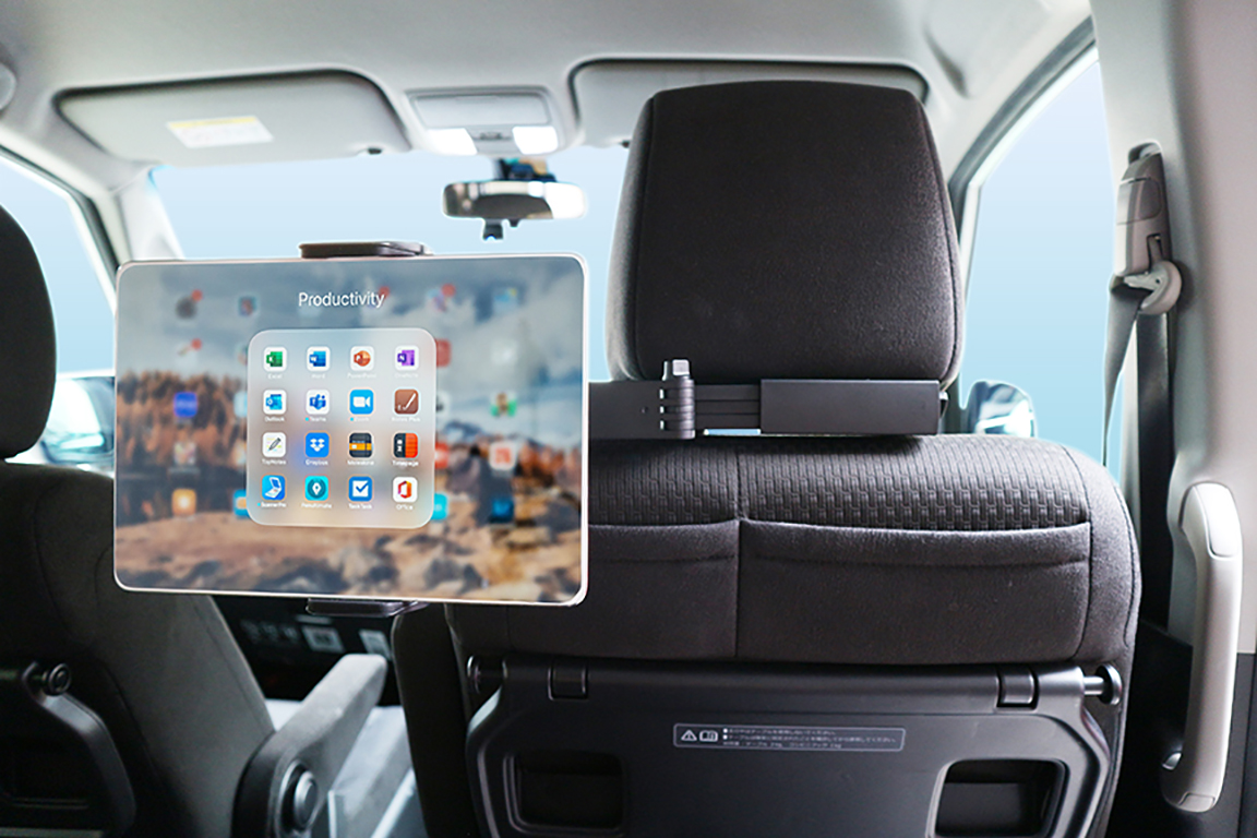 ▲位置調整アームで前後左右に可動するので、見やすい位置に固定できる。タブレットを座席の中央に近づければ、後部座席の両側に座った子どもたちが見やすくなる