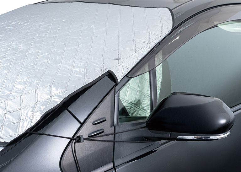 ▲端をドアに挟み、ヒモをサイドミラーに結ぶことで、風に飛ばされることを防げる