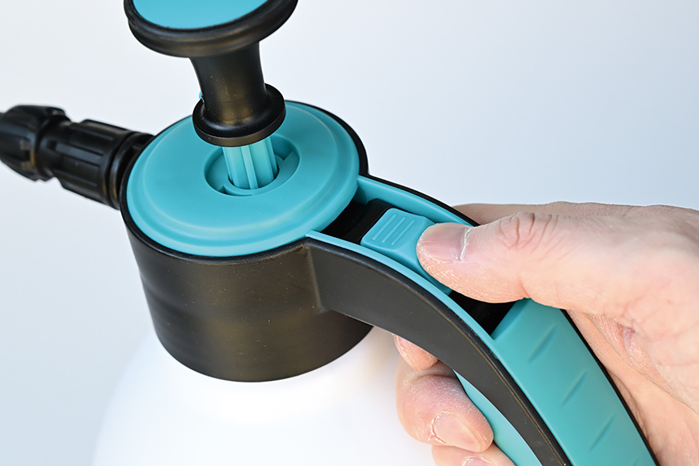 ▲噴射トリガーを押すとノズルから噴射。使用後はリリースバルブを引けば中の圧力を解放できる