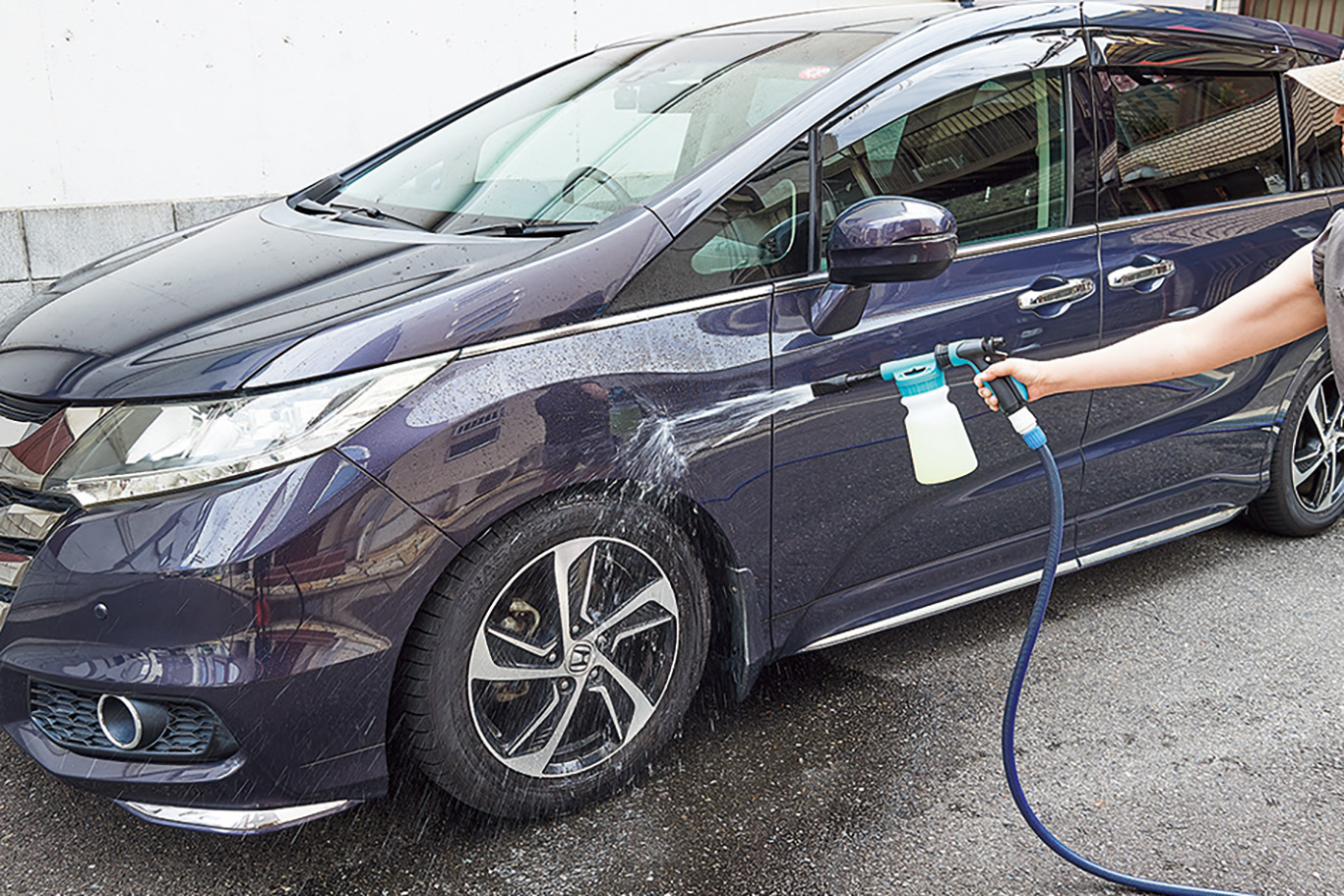▲泡噴射でボディを覆い、スポンジで洗ったら、ダイヤルを切り替えて水を噴射して洗い流す。水も泡も1台でできるのが便利