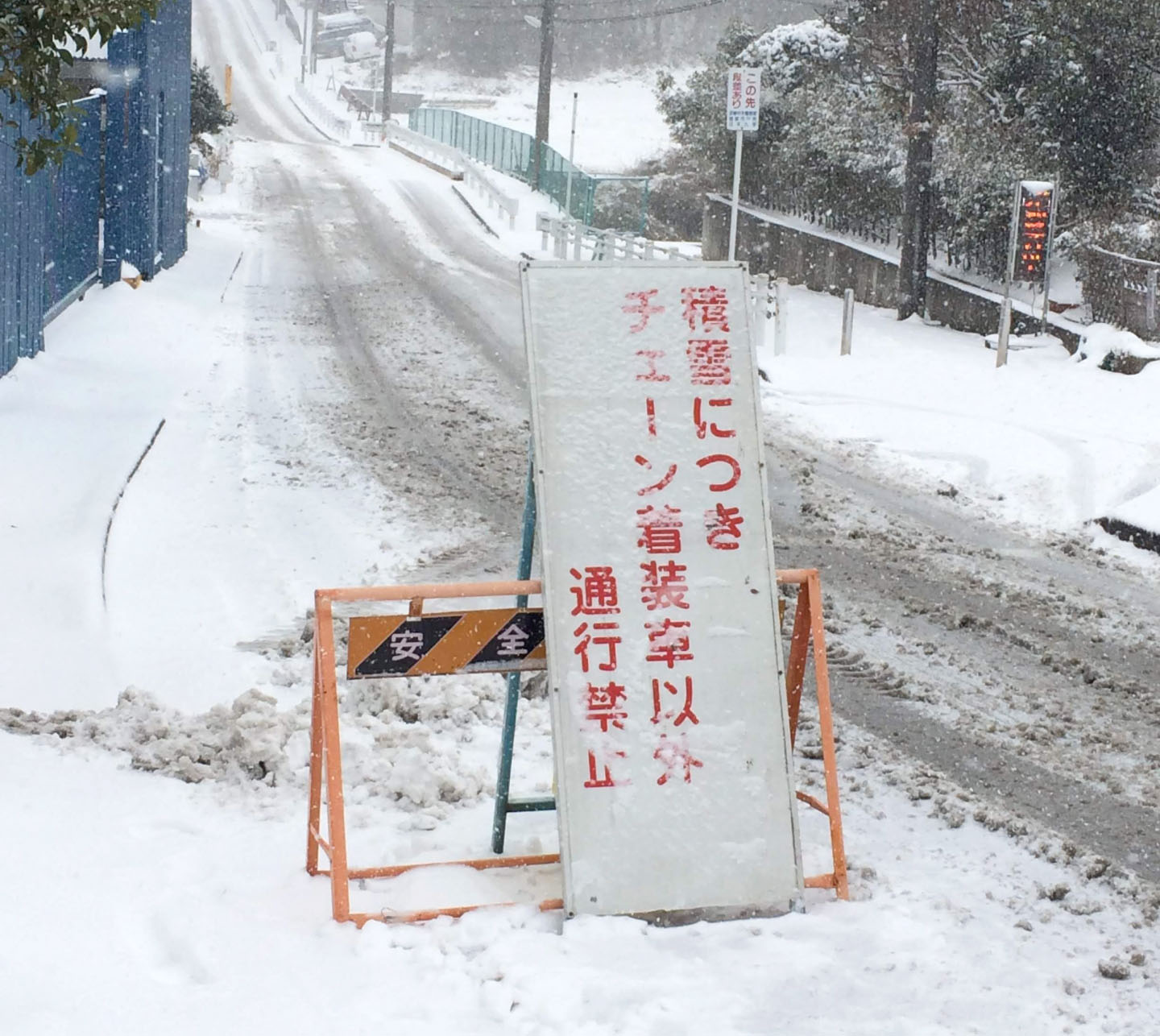 ▲チェーン規制区間では、標識(青地に白いイラスト)が掲示されるか、交通整理が行われる。チェーンは携行しておきたい