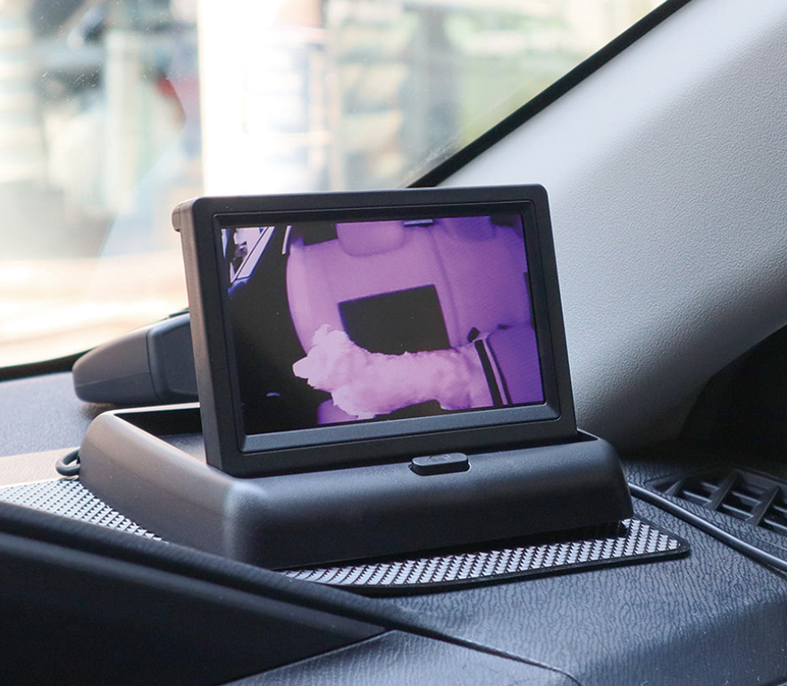 ▲モニターは使わないときには閉じられる。カメラはステーでヘッドレストポールに装着する