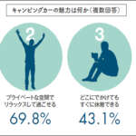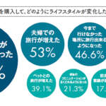 キャンピングカー購入後のライフスタイルの変化についても、「時間を気にせず旅行ができるようになった」が最多だが、次点で半数以上のユーザーが「夫婦での旅行が増えた」としており、家庭円満にも効果がありそうなことが伺えた。
