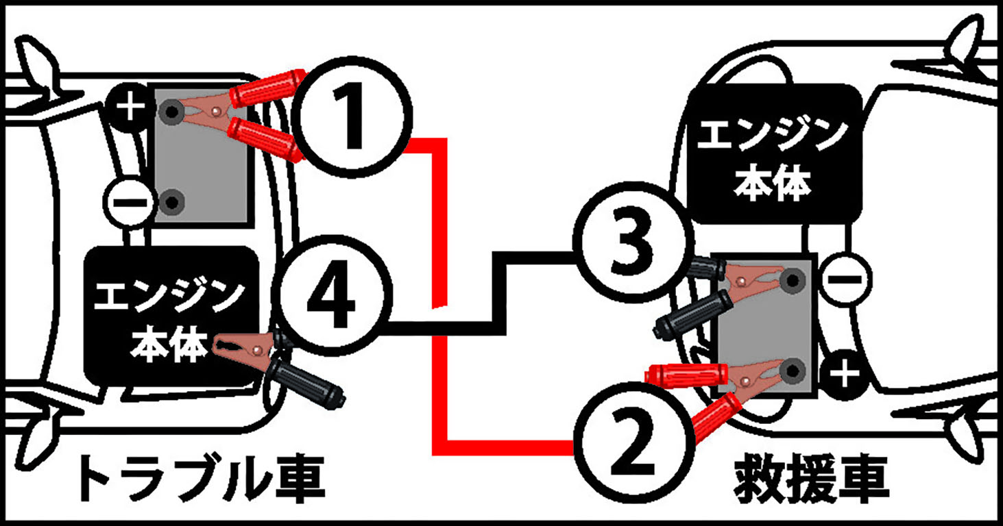 ▲①→②→③→④の順につなぐ。外すときは逆に④→③→②→①の順。これを間違えると火花が盛大に飛んだり、思いもよらぬ場所でショートさせたりして危険!